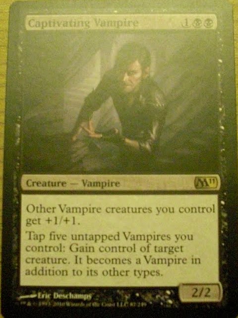 This guy, though, is another problem all together. Captivating Vampire is, in my option, one of the coolest vampire cards, because not only does he buff my other vampires, he also allows me to steal other people's creatures. Which is totally awesome since usually that requires blue cards and I really dislike blue. It's also cool because at least two of the guys I play with have vampire decks, so hopefully this will help give me a little bit of an edge.